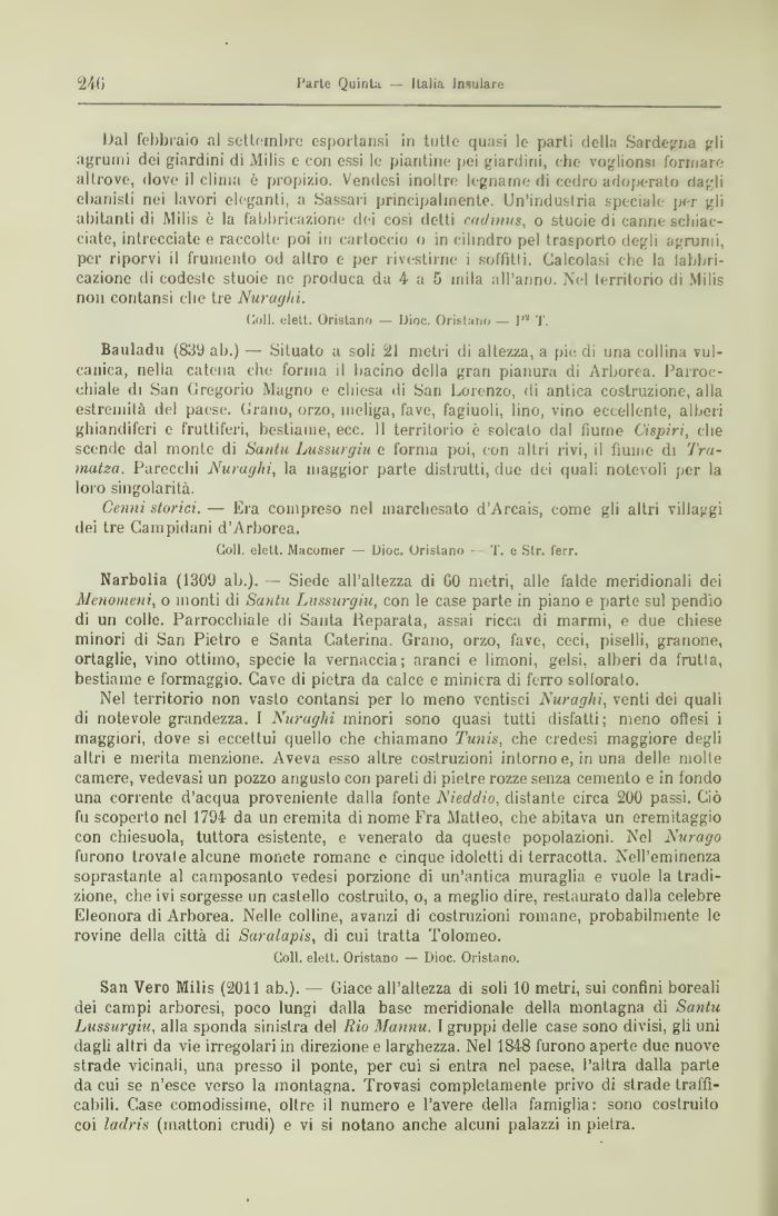 Bauladu (839 ab.) — Situato a soli 21 metri di altezza, a pie di una collina vulcanica, nella catena che forma il bacino della gran pianura di Arborea. Parrocchiale di San Gregorio Magno e chiesa di San Lorenzo, di antica costruzione, alla estremila del paese. Grano, orzo, meliga, fave, fagiuoli, lino, vino eccellente, alberi ghiandiferi e fruttiferi, bestiame, ecc. 11 territorio è solcato dal fiume C'ispiri, che scende dal monte di Saniti Lussurgìu e forma poi, con altri rivi, il fiume di Tra-matza. Parecchi Nuraghi, la maggior parte distrutti, due dei quali notevoli per la loro singolarità.