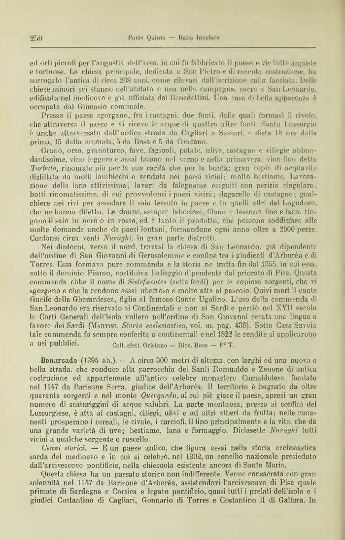 Bonarcado (1395 ab.). — A circa 300 metri di altezza, con larghi ed una nuova e bella strada, che conduce alla parrocchia dei Santi Romualdo e Zenone di antica costruzione ed appartenente all'antico celebre monastero Camaldolese, fondato nel 1147 da Barisone Serra, giudice dell'Arborea. Il territorio è bagnato da oltre quaranta sorgenti e nel monte Querquedu, al cui piè giace ii paese, apresi un gran numero di scaturiggini di acque salubri. La parte montuosa, presso ai confini del Lussurgiese, è atta ai castagni, ciliegi, ulivi e ad altri alberi da frutta; nelle rimanenti prosperano i cereali, le civaie, i carciofi, il lino principalmente e la vite, che dà una grande varietà di uve; bestiame, lana e formaggio. Diciasette Nuraghi tutti vicini a qualche sorgente o ruscello.