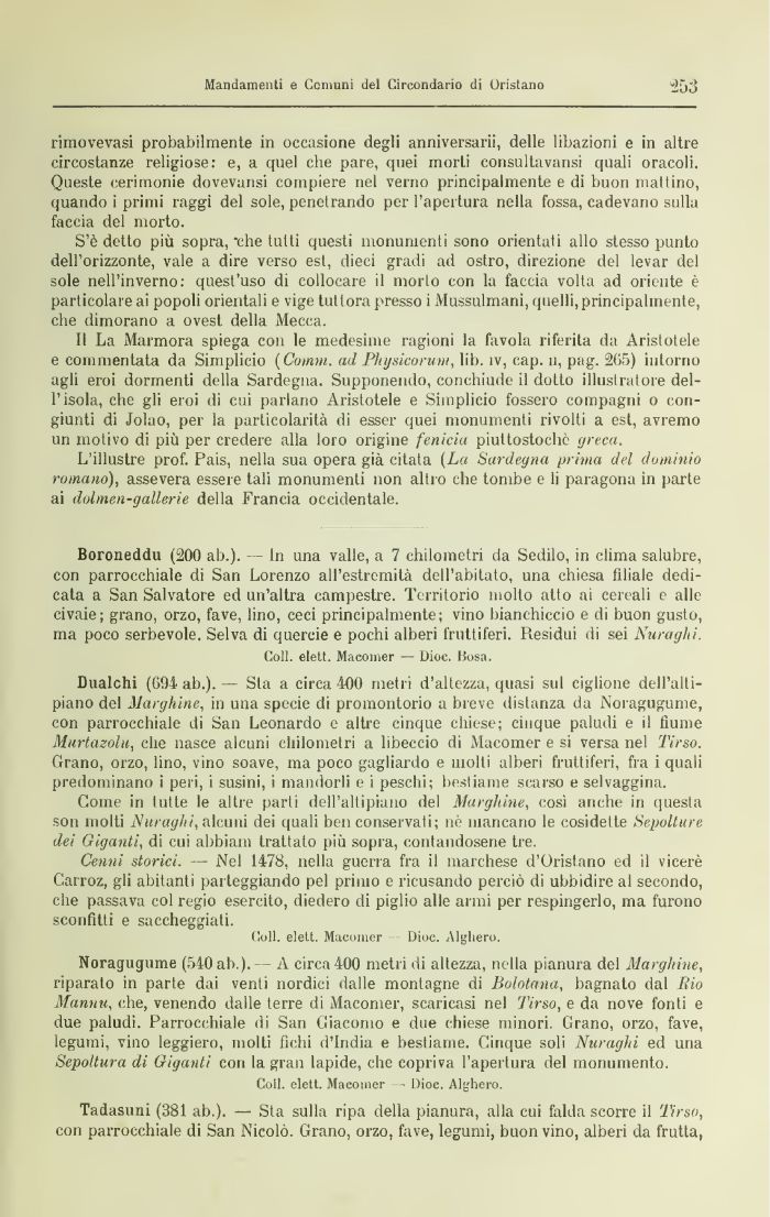 Dualchi (694 ab.). — Sta a circa 400 metri d'altezza, quasi sul ciglione dell'altipiano del Marghine, in una specie di promontorio a breve distanza da Noragugume, con parrocchiale di San Leonardo e altre cinque chiese; cinque paludi e il fiume Murtazolu, che nasce alcuni chilometri a libeccio di Macomer e si versa nel Tirso. Grano, orzo, lino, vino soave, ma poco gagliardo e molti alberi fruttiferi, fra i quali predominano i peri, i susini, i mandorli e i peschi; bestiame scarso e selvaggina.