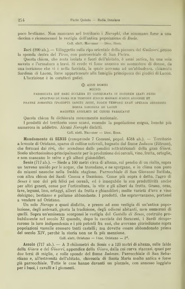 Assolo (717 ab.). — A3 chilometri da Senis e a 120 metri di altezza, sulle falde della Giara e del Giuerri, appendice della Giara, dalla cui curva staccasi, quasi per due terzi di miglio, e sulle sponde del fiume Imbessu. Parrocchiale di San Sebastiano e, all'estremità dell'abitato, chiesuola di Santa Maria molto antica e forse già parrocchiale. Tutte le case hanno davanti un piazzale, con annesso loggiato per i buoi, ì cavalli e ì giumenti.