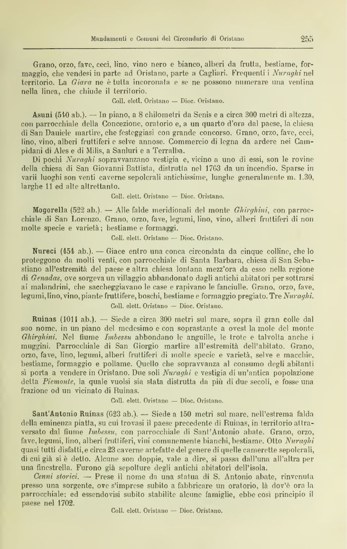 Nureci (454 ab.). — Giace entro una conca circondata da cinque colline, che lo proteggono da molti venti, con parrocchiale di Santa Barbara, chiesa di San Seba-sliano all'estremità del paese e altra chiesa lontana mezz'ora da esso nella regione di Genadas, ove sorgeva un villaggio abbandonato dagli antichi abitatori per sottrarsi ai malandrini, che saccheggiavano le case e rapivano le fanciulle Grano, orzo, fave, legumi, lino, vino,piante fruttifere, boschi, bestiame e formaggio pregiato. Tre Nuraghi.