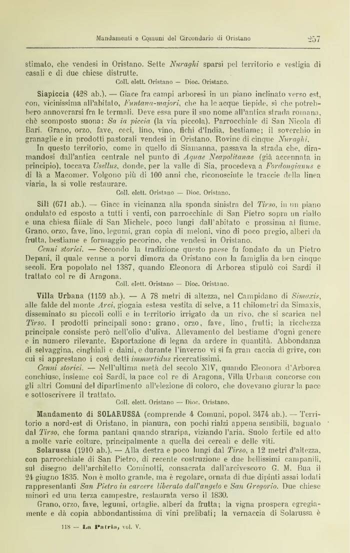 Siapiccia (428 ah.). — Giace fra campi arhoresi in un piano inclinato verso est, con, vicinissima all'abitato, Fnntana-majorì, che ha le acque tiepide, sì che potrebbero annoverarsi fra le termali. Deve essa pure il suo nome all'antica strada romana, che scomposto suona: Sa in pìccia (la via piccola). Parrocchiale di San Nicola di Bari. Grano, orzo, fave, ceci, lino, vino, fichi d'India, bestiame; il soverchio in granaglie e in prodotti pastorali Vendesi in Oristano. Rovine di cinque Nuraghi.