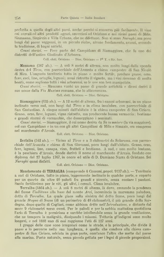 Terraìba (4464 ab.). — A soli 8 metri di altezza, là dove, cessando la pendenza del fiume Usellitano alla base del monte Arci, incomincia la maremma paludosa, detta di Terralba. La quale giace sulla sinistra del detto fiume, poco lungi dal grande Stagno di Sassu (di un perimetro di 48 chilometri), il più grande della Sardegna. dopo quello di Cagliari, corno abbiam dotto neìV Introduzione, e distan'e dal mare 9 chilometri verso ovest. Per le paludi e por la nebbia mattutina quotidiana l'aria di Terralba è perniciosa e sarebbe intollerabile senza la grande ventilazione, che ne tempera la malignità, dissipando i miasmi. Tuttavia gl'indigeni sono molto longevi, e noi 1888 uno di essi raggiunse l'età di 127 anni,