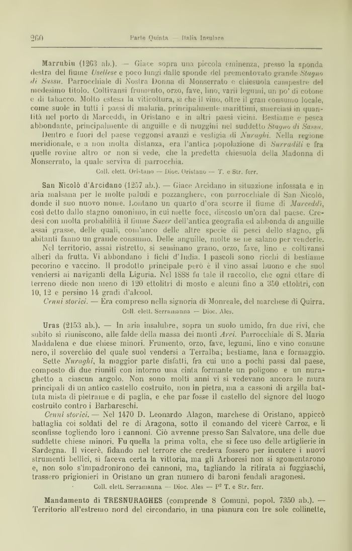 Marmimi (1203 ab.). — Giace sopra una piccola eminenza, presso la sponda destra del fiume Uselkse e poco lungi dalle sponde del premerli ovato grande Stagno ili S«ssm l'arrocchiale di Nostra Donna di Monserrato o chiesuola campestre del medesimo titolo. Coltivane! frumento, orzo, fave, litio, vari! legumi, un po' di cotone e di tabacco. Molto estesa la viticoltura, si che il vino, oltre il gran consumo locale, come suole in tutti i paesi di malaria, principalmente marittimi, smerciasi in quantità nel porto di Marceddi, in Oristano e in altri paesi vicini. Bestiame e pesca abbondante, principalmente di anguille e di muggini nel suddetto Stagno di Sassu.