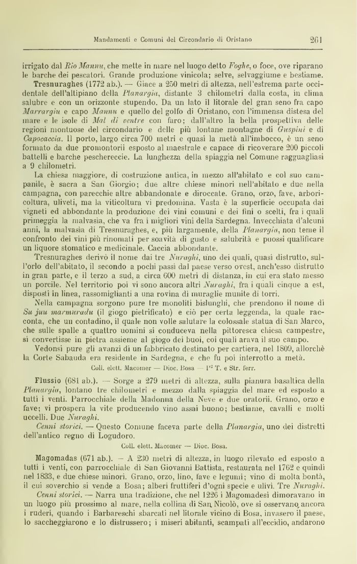 Magomadas (671 ab.). — A 230 metri di altezza, in luogo rilevato ed esposto a tutti i venti, con parrocchiale di San Giovanni Battista, restaurata nel 1762 e quindi nel 1833, e due chiese minori. Grano, orzo, lino, fave e legumi; vino di molta bontà, il cui soverchio si vende a Bosa; alberi fruttiferi d'ogni specie e ulivi. Tre Nuragìii.
