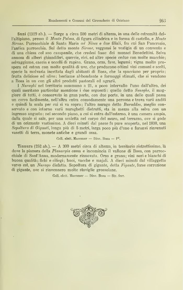 Suni (1319 ah.). — Sorge a circa 500 metri di altezza, in una delle estremità dell'altipiano, presso il Monte Palma, di figura cilindrica e in forma di castello, e Monte Sirone. Parrocchiale di Santa Maria ad Nives e due filiali, fra cui San Pancrazio, l'antica parrocchia. Sul detto monte Sirone, veggonsi le vestigia di un convento e di una chiesa col suo campanile, che credesi fosse dei monaci Benedettini. Selva annosa di alberi ghiandiferi, quercie, elei, ed altre specie cedue con molte macchie; selvaggiume, caccia e uccelli di rapina. Grano, orzo, fave, legumi; vigna molto prospera ed estesa con molte qualità di uve, che producono ottimi vini comuni e scelti, specie la malvasìa incettata dagli abitanti di Bosa, che la spacciano per propria; frutta deliziose ed ulive; bestiame abbondante e formaggi stimati, che si vendono a Bosa in un con gli altri prodotti pastorali ed agrar i