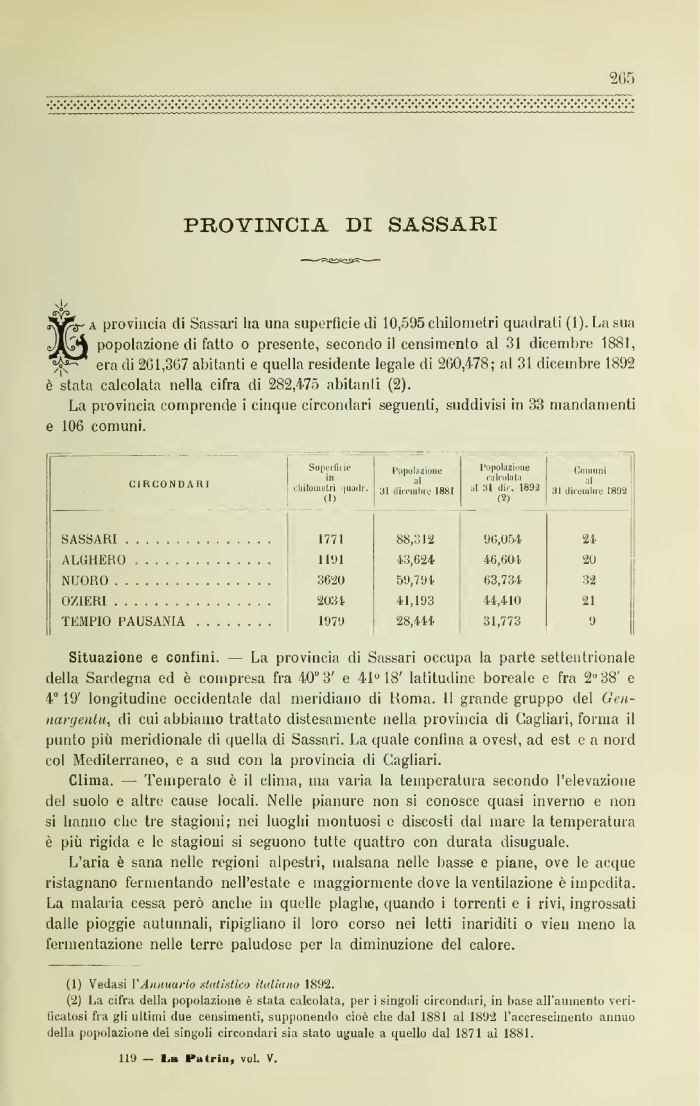 a provìncia di Sassari ha una superficie di 10,505 chilometri quadrali (1). La sua «JjL^J popolazione di fallo o presente, secondo il censimento al 31 dicembre 1881, era di 201,367 abitanti e quella residente legale di 200,478; al 31 dicembre 1892 è stata calcolata nella cifra di 282,475 abitanti (2).