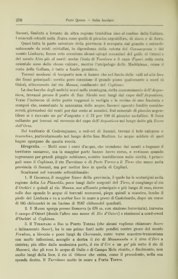 Idrografia. — Molti sono i corsi d'acqua, che scendono dai monti a bagnare il territorio sassarese, ma la maggior parte hanno breve corso, e rovinoso quando ingrossano per grandi pioggie subitanee, mentre inaridiscono nelle siccità. I primi-pali sono li Coghinas, il rio Turritano o di Porto Torres e il Tirso che nasce nella provincia di Sassari, ma per metter foce in quella di Cagliari.