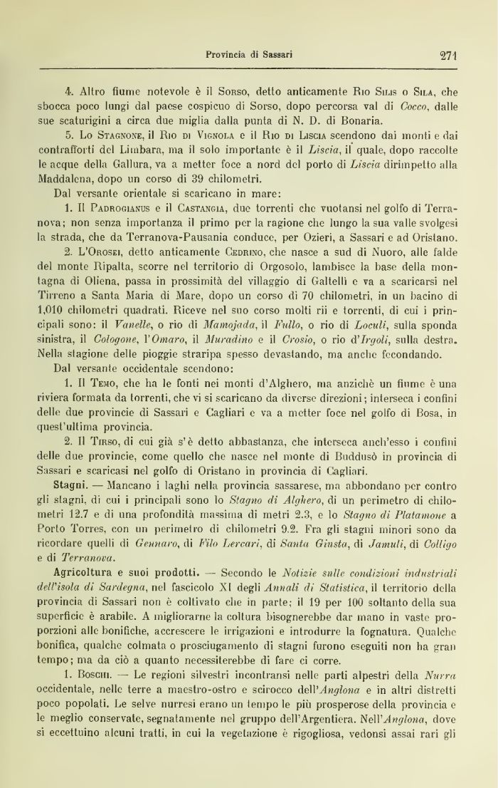 4. Altro fiume notevole è il Sorso, detto anticamente Rio Sius o Sila, che sbocca poco lungi dal paese cospicuo di Sorso, dopo percorsa vai di Cocco, dalle sue scaturigini a circa due miglia dalla punta di N. D. di Bonaria.