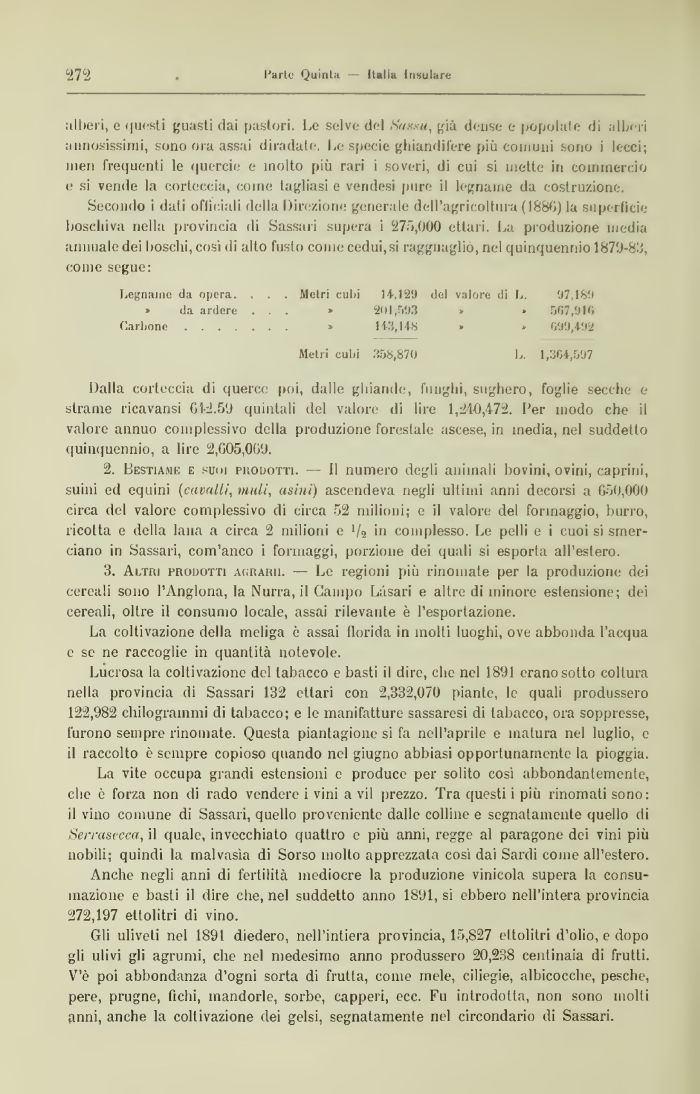 Dalla corteccia di querce poi, dalle ghiande, funghi, sughero, foglie secche e strame ricavanti Gfeì.59 quintali del valore di lire 1,240,472. I'er modo che il valore annuo complessivo della produzione forestale ascese, in media, nel suddetto quinquennio, a lire 2,005,009.