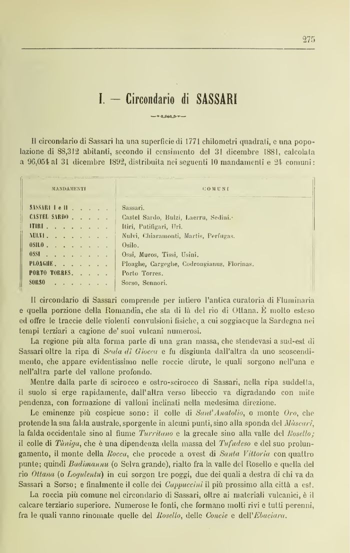 Il circondario di Sassari comprende per intiero l'anlica curatoria di Fluminaria e quella porzione della Romandia, che sta di là del rio di Ottana. È molto esteso ed offre le traccie delle violenti convulsioni fisiche, a cui soggiacque la Sardegna nei tempi terziari a cagione de' suoi vulcani numerosi.