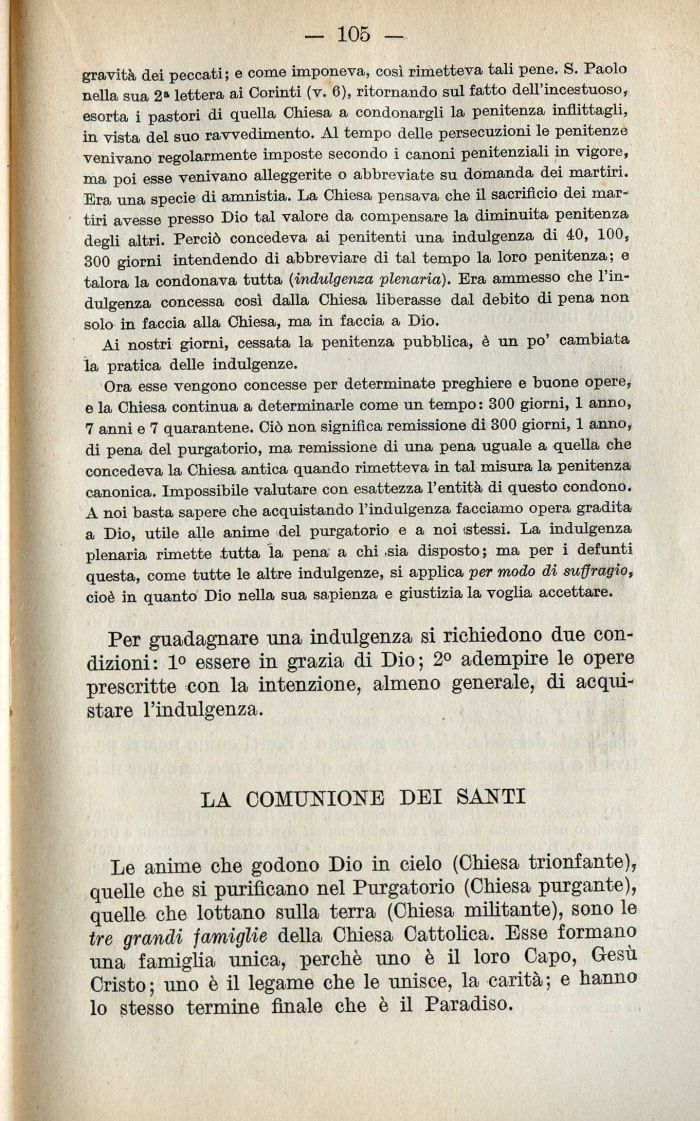gravità dei peccati ; e come imponeva, così rimetteva tali pene. S. Paolo nella sua 2' lettera ai Corinti (v. 6), ritornando sul fatto dell'incestuoso, esorta i pastori di quella Chiesa a condonargli la penitenza inflittagli, in vista del suo ravvedimento. Al tempo delle persecuzioni le penitenze venivano regolarmente imposte secondo i canoni penitenziali in vigore, ma poi esse venivano alleggerite o abbreviate su domanda dei martiri. Era una specie di amnistia. La Chiesa pensava che il sacrificio dei martiri avesse presso Dio tal valore da compensare la diminuita penitenza degli altri. Perciò concedeva ai penitenti una indulgenza di 40, 100, 300 giorni intendendo di abbreviare di tal tempo la loro penitenza; e talora la condonava tutta (indulgenza plenaria). Era ammesso che l'indulgenza concessa così dalla Chiesa liberasse dal debito di pena non solo in faccia alla Chiesa, ma in faccia a Dio.