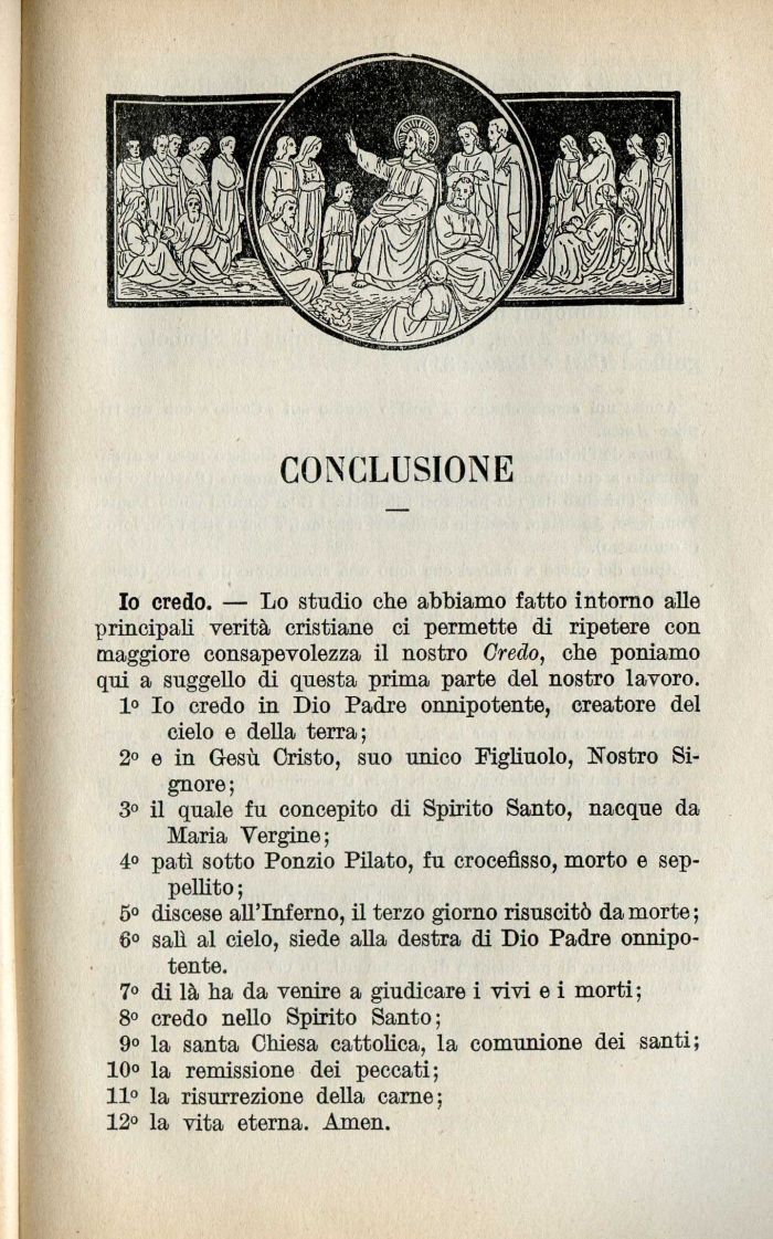 Io credo. — Lo studio che abbiamo fatto intorno alle principali verità cristiane ci permette di ripetere con maggiore consapevolezza il nostro Credo, che poniamo qui a suggello di questa prima parte del nostro lavoro.