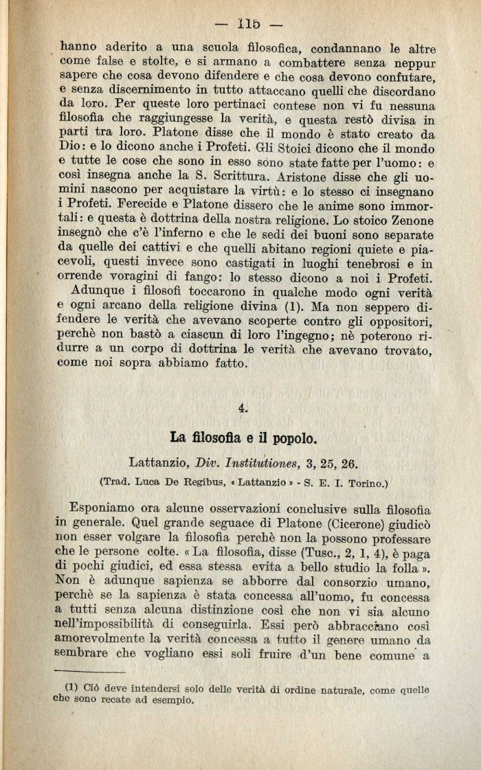 Esponiamo ora alcune osservazioni conclusive sulla filosofia in generale. Quel grande seguace di Platone (Cicerone) giudicò non esser volgare la filosofia perchè non la possono professare che le persone colte. « La filosofia, disse (Tusc., 2, 1, 4), è paga di pochi giudici, ed essa stessa evita a bello studio la folla ». Non è adunque sapienza se abborre dal consorzio umano, perchè se la sapienza è stata concessa all'uomo, fu concessa a tutti senza alcuna distinzione così che non vi sia alcuno nell'impossibilità di conseguirla. Essi però abbracciano così amorevolmente la verità concessa a tutto il genere umano da sembrare che vogliano essi soli fruire d'un bene comune a