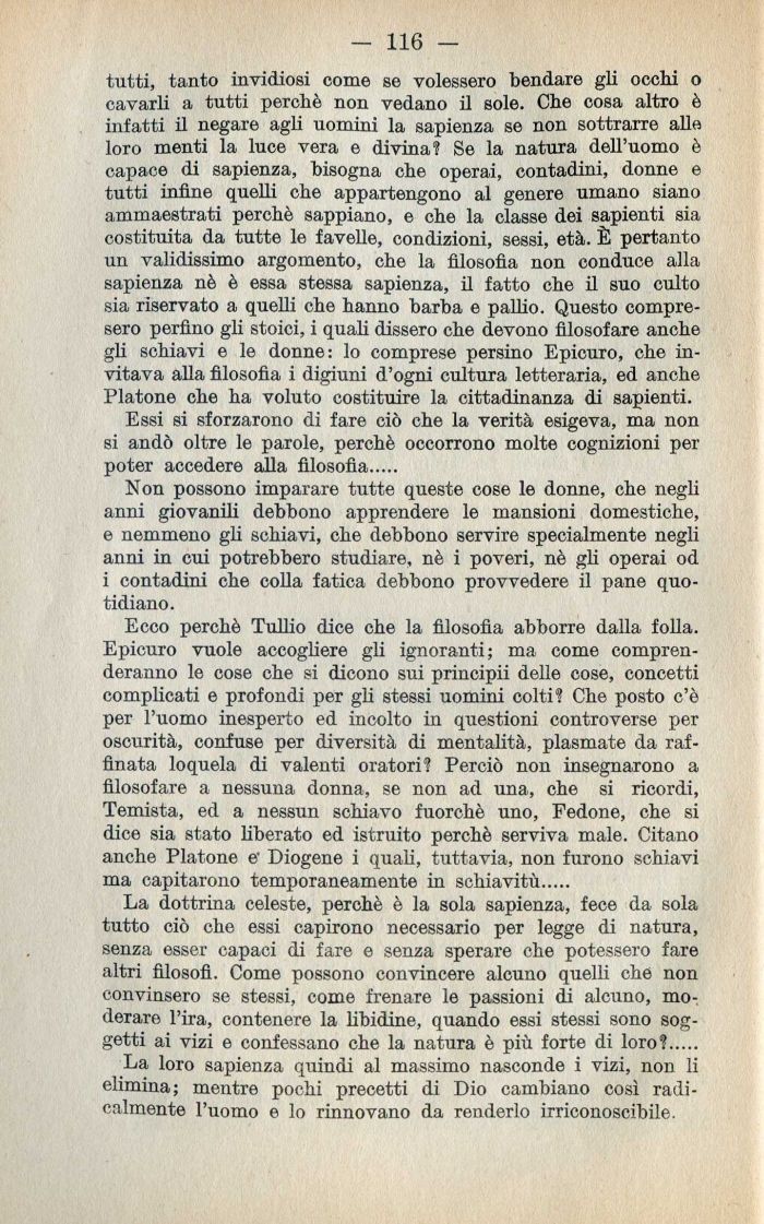 tutti, tanto invidiosi come se volessero bendare gli ocelli o cavarli a tutti perchè non vedano il sole. Clie cosa altro è infatti il negare agli uomini la sapienza se non sottrarre alle loro menti la luce vera e divina? Se la natura dell'uomo è capace di sapienza, bisogna che operai, contadini, donne e tutti infine quelli che appartengono al genere umano siano ammaestrati perchè sappiano, e che la classe dei sapienti sia costituita da tutte le favelle, condizioni, sessi, età. È pertanto un validissimo argomento, che la filosofìa non conduce alla sapienza nè è essa stessa sapienza, il fatto che il suo culto sia riservato a quelli che hanno barba e pallio. Questo compresero perfino gli stoici, i quali dissero che devono filosofare anche gli schiavi e le donne: lo comprese persino Epicuro, che invitava alla filosofia i digiuni d'ogni cultura letteraria, ed anche Platone che ha voluto costituire la cittadinanza di sapienti.