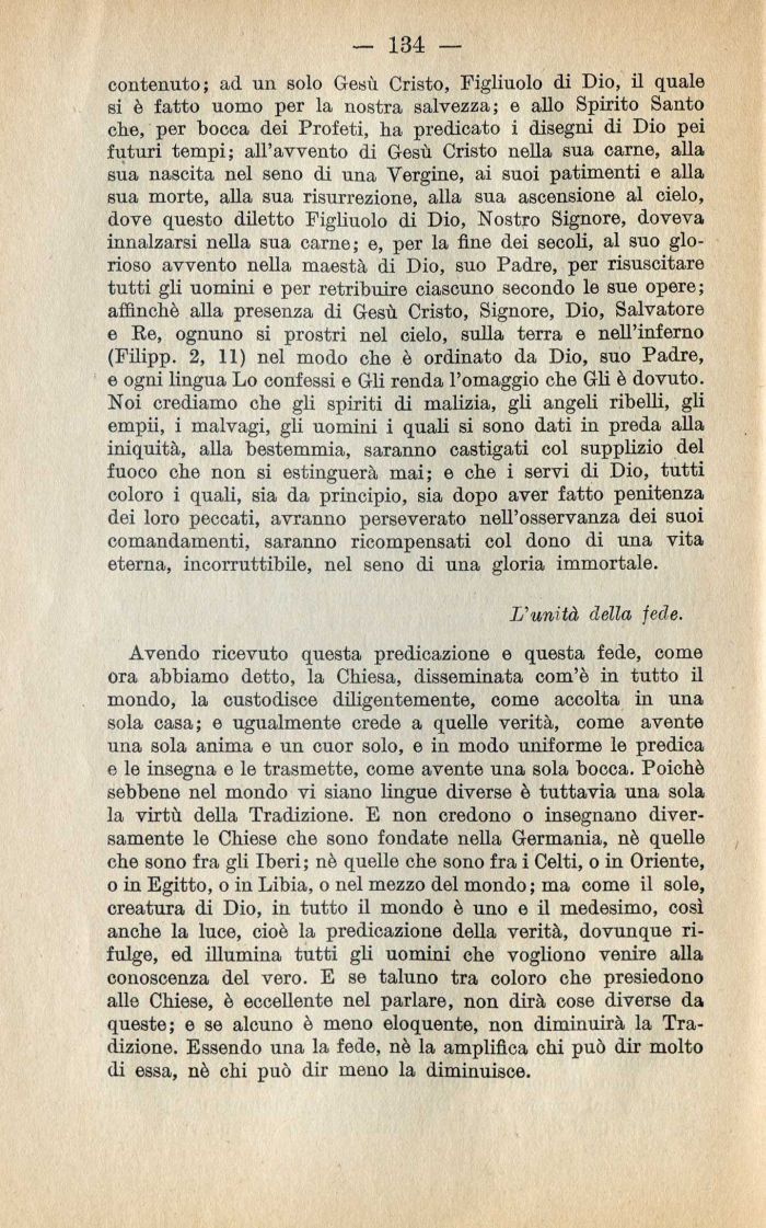Avendo ricevuto questa predicazione e questa fede, come ora abbiamo detto, la Chiesa, disseminata com'è in tutto il mondo, la custodisce diligentemente, come accolta in una sola casa; e ugualmente crede a quelle verità, come avente una sola anima e un cuor solo, e in modo uniforme le predica e le insegna e le trasmette, come avente una sola bocca. Poiché sebbene nel mondo vi siano lingue diverse è tuttavia una sola la virtù della Tradizione. E non credono o insegnano diversamente le Chiese che sono fondate nella Germania, nè quelle che sono fra gli Iberi ; nè quelle che sono fra i Celti, o in Oriente, o in Egitto, o in Libia, o nel mezzo del mondo ; ma come il sole, creatura di Dio, in tutto il mondo è uno e il medesimo, così anche la luce, cioè la predicazione della verità, dovunque rifulge, ed illumina tutti gli uomini che vogliono venire alla conoscenza del vero. E se taluno tra coloro che presiedono alle Chiese, è eccellente nel parlare, non dirà cose diverse da queste; e se alcuno è meno eloquente, non diminuirà la Tradizione. Essendo una la fede, nè la amplifica chi può dir molto (li essa, nè chi può dir meno la diminuisce.