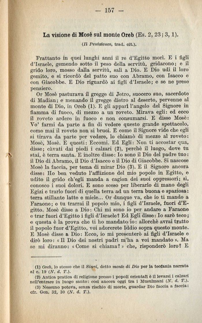 Or Mosè pasturava il gregge di Jetro, suocero suo, sacerdote di Madian; e menando il gregge dietro al deserto, pervenne al monte di Dio, in Oreb (1). E gli apparì l'angelo del Signore in fiamma di fuoco, di mezzo a un roveto. Mirava egli: ed ecco il roveto ardere in fuoco e non consumarsi. E disse Mosè: Yo' farmi da parte a fin di vedere questo grande spettacolo, come mai il roveto non si bruci. E come il Signore vide che egli si tirava da parte per vedere, lo chiamò di mezzo al roveto: Mosè, Mosè. E questi: Eccomi. Ed Egli: Non ti accostar qua, disse; cavati dai piedi i calzari (2), perchè il luogo, dove tu stai, è terra santa. E inoltre disse : Io sono il Dio del padre tuo : il Dio di Abramo, il Dio d'Isacco e il Dio di Giacobbe. Si nascose Mosè la faccia, per tema di mirar Dio (3). E il Signore ancora disse: Ho ben veduto l'afflizione del mio popolo in Egitto, e udito il grido ch'egli manda a cagion dei suoi oppressori; sì, conosco i suoi dolori. E sono sceso per liberarlo di mano degli Egizi e trarlo fuori di quella terra ad un terra buona e spaziosa : terra stillante latte e miele... Or dunque va, che io ti mando a Faraone; e tu trarrai il popolo mio, i figli d'Israele, fuori d'Egitto. Mosè disse a Dio: Chi mi sono io per andare a Faraone e trar fuori d'Egitto i figli d'Israele? Ed ,SgIi disse: Io sarò teco; « questa è la prova che ti ho mandato io : allorché avrai tratto il popolo fuor d'Egitto, voi adorerete Iddio sopra questo monte. E Mosè disse a Dio: Ecco, io mi presenterò ai figli d'Israele e dirò loro : « Il Dio dei nostri padri m'ha a voi mandato ». Ma se mi diranno: «Come si chiama?» che, risponderò loro? E