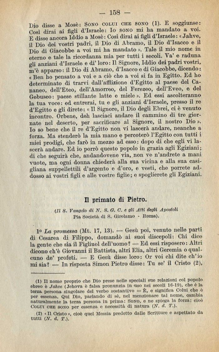 (1) Il nome proprio che Dio prese nelle speciali sue relazioni col popolo ebreo è Jahve ( Jehova è falsa pronunzia in uso nei secoli 16-19), che è la terza persona singolare del verbo sostantivo = È, o significa Colui che ò per essenza. Qui Dio, parlando di sè, nel menzionare tal nome, cambia naturalmente la terza persona in prima: Sono, e no spiega la forza: cioè Colto che sono per essenza e necessità di natura (2V. d. T.).