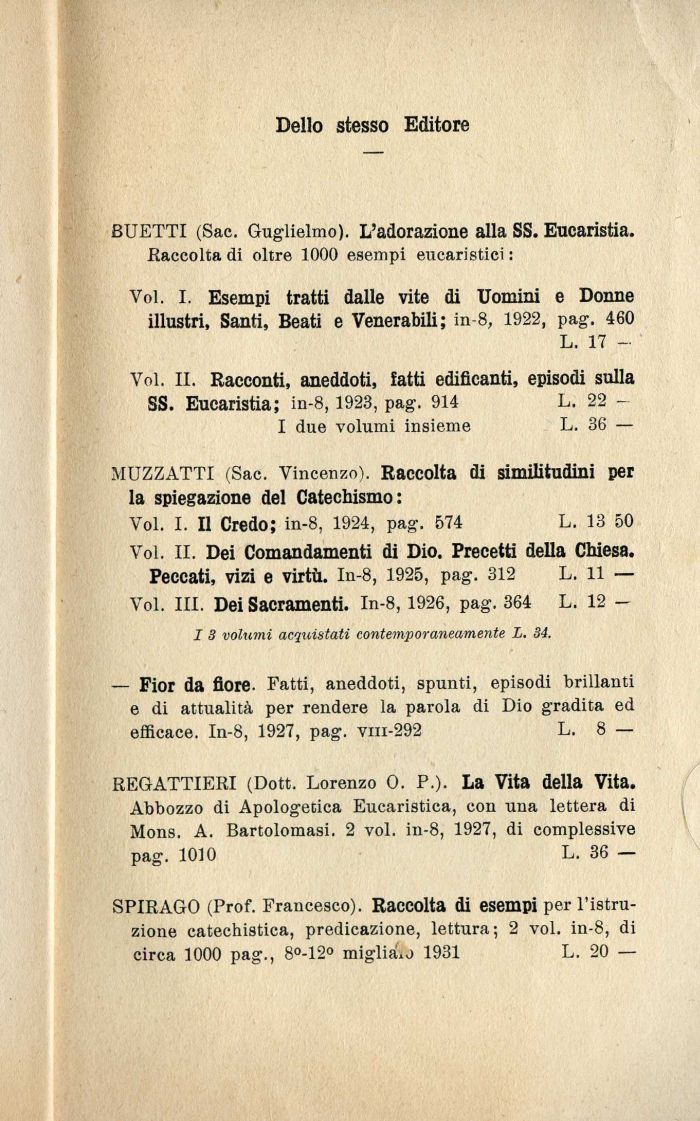 Voi. II. Racconti, aneddoti, fatti edificanti, episodi sulla SS. Eucaristia; in-8,1923, pag. 914 L. 22 -