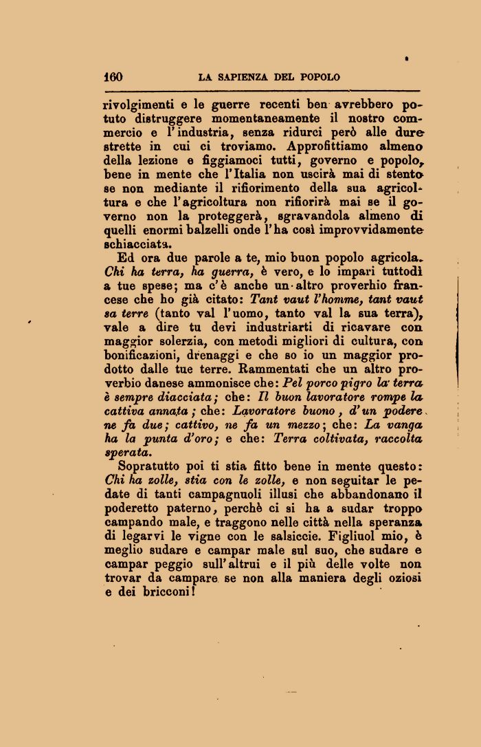 Sopratutto poi ti stia fitto bene in mente questo: Chi ha zolle, stia con le zolle, e non seguitar le pedate di tanti campagnuoli illusi che abbandonano il poderetto paterno, perchè ci si ha a sudar troppo campando male, e traggono nelle città nella speranza di legarvi le vigne con le salsiccie. Figliuol mio, è meglio sudare e campar male sul suo, che sudare e campar peggio sull'altrui e il più delle volte non trovar da campare se non alla maniera degli oziosi e dei bricconi!