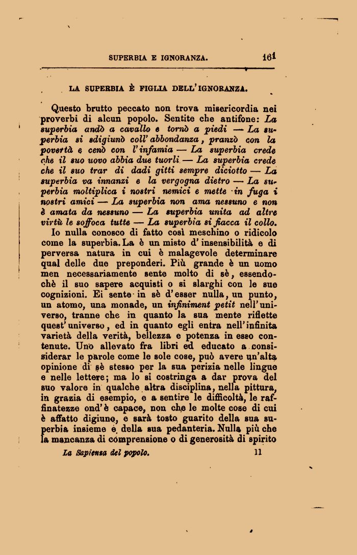 Io nulla conosco di fatto così meschino o ridicolo come la superbia. La è un misto d'insensibilità e di perversa natura in cui è malagevole determinare qual delle due preponderi. Più grande è un uomo men necessariamente sente molto di sè, essendoché il suo sapere acquisti o si slarghi con le sue cognizioni. Ei sente in sè d'esser nulla, un punto, un atomo, una monade, un infiniment petit nell'universo, tranne che in quanto la sua mente riflette quest'universo, ed in quanto egli entra nell'infinita varietà della verità, bellezza e potenza in esso contenute. Uno allevato fra libri ed educato a consi-siderar le parole come le sole cose, può avere un'alta opinione di gè stesso per la sua perizia nelle lingue e nelle lettere; ma lo si costringa a dar prova del suo valore in qualche altra disciplina, nella pittura, in grazia di esempio, e a sentire le difficoltà, le raffinatezze ond' è capace, non che le molte cose di cui è affatto digiuno, e sarà tosto guarito della sua superbia insieme e, della sua pedanteria. Nulla più che la mancanza di cómprensione o di generosità di spirito La Sapitnta del popolo. 11