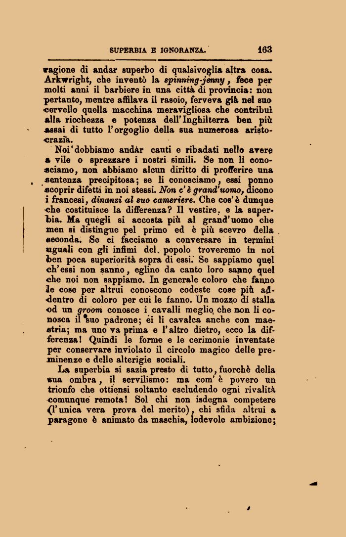 «ragione di andar superbo di qualsivoglia altra cosa. Arkwright, che inventò la spinning-jenny, fece per molti anni il barbiere in una città di provincia: non pertanto, mentre affilava il rasoio, ferveva già nel suo cervello quella macchina meravigliosa che contribuì alla ricchezza e potenza dell'Inghilterra ben più -assai di tutto l'orgoglio della sua numerosa aristocrazia.