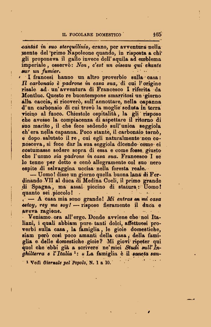 Veniamo.ora all'ergo. Donde avviene cbe noi Italiani, i quali abbiam pure- tanti dolci, affettuosi proverbi sulla casa, la famiglia, le gioie domestiche, siam però così poco amanti della casa, della famiglia e delle domestiche gioie? Mi giovi ripeter qui quel che ebbi già a scrivere ne'miei Studi sull'Inghilterra e l'Italial: «La famigliti è il scmctà san-