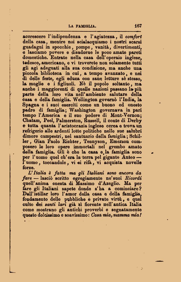 L'Italia è fatta ma gli Italiani sono aricora da fare — lasciò scritto egregiamente ne'suoi Ricordi quell'anima onesta di Massimo d'Azeglio. Ma per fare gli Italiani sapete donde s'ha a cominciare? Dall'istillar loro l'amor della casa e della famiglia, fondamento delle pubbliche e private virtù, e quel culto dei santi lari già sì fiorente nell'antica Italia come mostrano gli antichi proverbi e segnatamente questo dolcissimo e soavissimo : Casa mia, mamma mia!