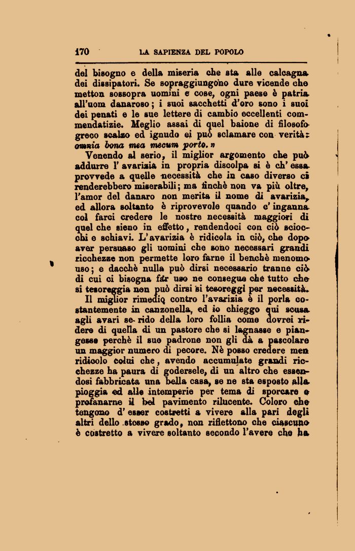 del bisogno e della miseria che sta alle calcagna dei dissipatori. Se sopraggiungòno dure vicende che metton sossopra uomini e cose, ogni paese è patria all'uom danaroso ; i suoi sacchetti d'oro sono i suoi dei penati e le sue lettere di cambio eccellenti commendatizie. Meglio assai di quel baione di filosofo greco scalzo ed ignudo ei può sclamare con verità; omnia bona mea mecum porto. »