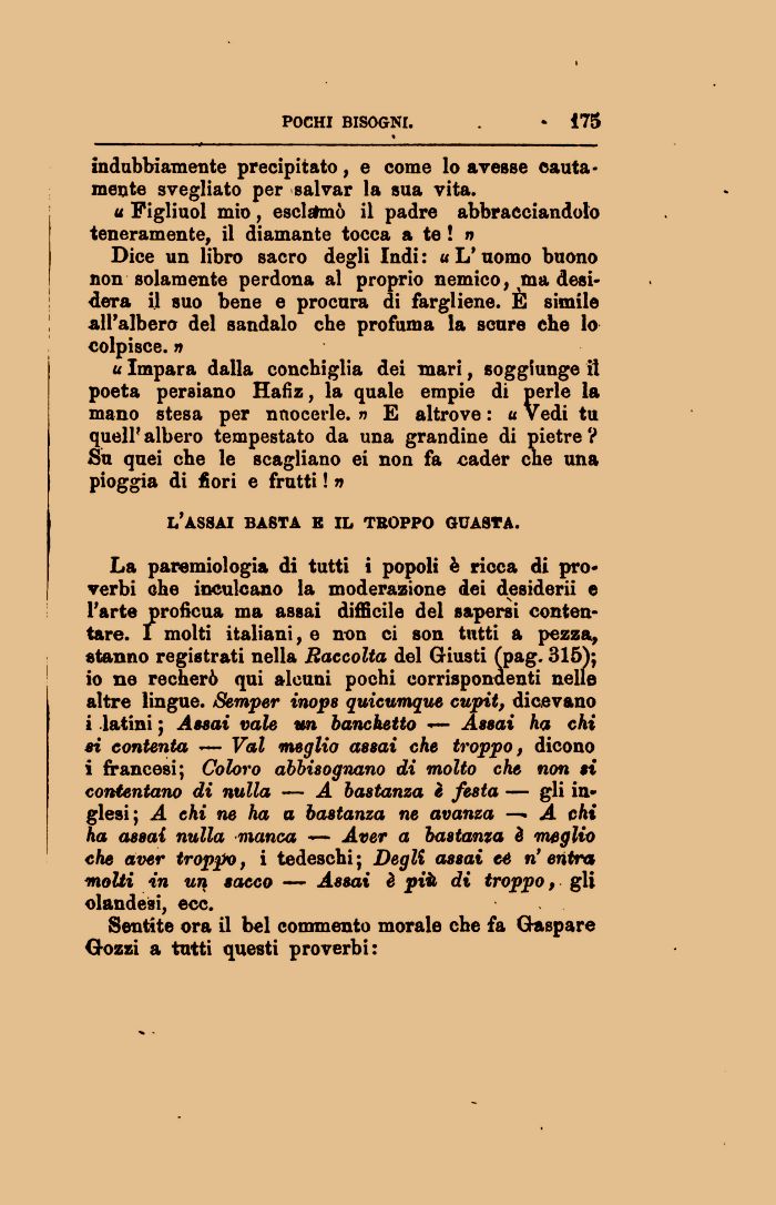 La paremiologia di tutti i popoli è ricca di proverbi che inculcano la moderazione dei desiderii e l'arte proficua ma assai difficile del sapersi contentare. I molti italiani, e non ci son tutti a pezza, stanno registrati nella Raccolta del Giusti (pag. 315); io ne recherò qui alcuni pochi corrispondenti nelle altre lingue. Scraper inops quicumque cupit, dicevano i latini ; Assai vale un banchetto — Assai ha chi ei contenta -— Val meglio assai che troppo, dicono i francesi; Coloro abbisogìiano di molto che non si contentano di nulla —¦ A bastanza è festa — gli inglesi; A chi ne ha a bastanza ne avanza —• A chi ha assai nulla manca — Aver a bastanza è meglio che aver troppo, i tedeschi; Degli assai te n'entra molti in un sacco — Assai è piò, di troppo, gli olandesi, ecc.