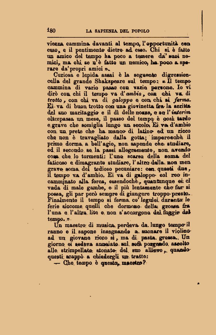 Curiosa e lepida assai è la seguente digressione-eli a del grande Shakspeare sul tempo. « Il tempo cammina di vario passo con varie persone. Io vi dirò eoa, chi il tempo va d'ambia f con chi va di trotta , con chi va di galoppo e eoa chi si ferma. Hi va di buon trotto con una giovinetta fra- la scritta del suo maritaggio e il dì delle nozze, e sa l'interim oltr.epassa un mese, il passo del tempq è così tardo e grave che somiglia lungo un secolo* Ei va d'ambio con un prete che ha manco- di latino* ed un ricco che non è travagliato dalla gotta; impereechè. il primo dorma, a bell'agio,, non sapendo che,- studiare, ed il secondo se. la. passi allegramente, non. avendo cosa che lo tormenti: L'urna scarsa della asma del faticoso e dimagrante studiare, l'altra della, non men grave soma, del tedioso pecuniare : con. questi due , il tempo va d'ambio, Ei va di galoppo- col reo incamminato alla forca, essendoché., quantunque ei. ci vada di male gambe, e il più lentamente che far si possa, gli par però sempre di giungere troppo-presto» Finalmente il tempo si ferma, co' legulei, durante le ferie siccome quelli che dormono della grossa fi» l'una e l'altra lite e. non a'accorgono del.fuggi? del tempo, n