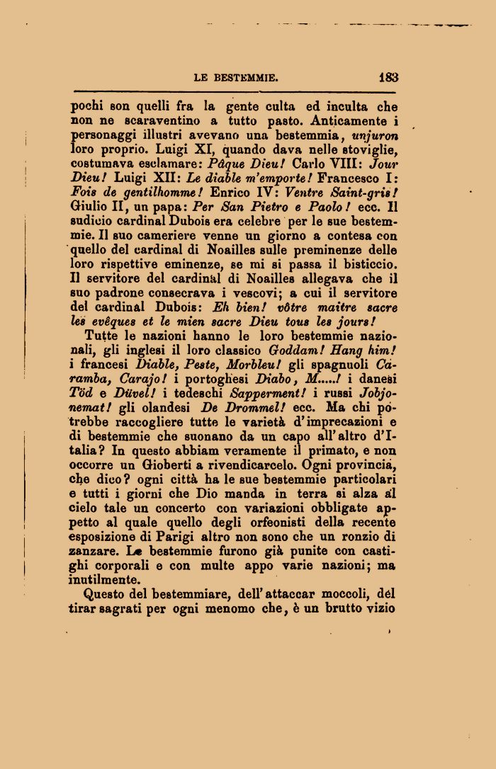 Tutte le nazioni hanno le loro bestemmie nazionali, gli inglesi il loro classico Goddam! Hang him! i francesi Diable, Peste, Morbleu! gli spagnuoli Ca-ramba, Carajo! i portoghesi Diàbo, M....J i danesi Tod e Diivel! i tedeschi Sapperment! i russi Jobjo-nemat! gli olandesi De Drommel! ecc. Ma chi potrebbe raccogliere tutte le varietà d'imprecazioni e di bestemmie che suonano da un capo all'altro d'Italia? In questo abbiam veramente il primato, e non occorre un Gioberti a rivendicarcelo. Ogni provincia, che dico? ogni città ha le Bue bestemmie particolari e tutti i giorni che Dio manda in terra si alza ali cielo tale un concerto con variazioni obbligate appetto al quale quello degli orfeonisti della recente esposizione di Parigi altro non sono che un ronzio di zanzare. Le bestemmie furono già punite con castighi corporali e con multe appo varie nazioni; ma inutilmente.
