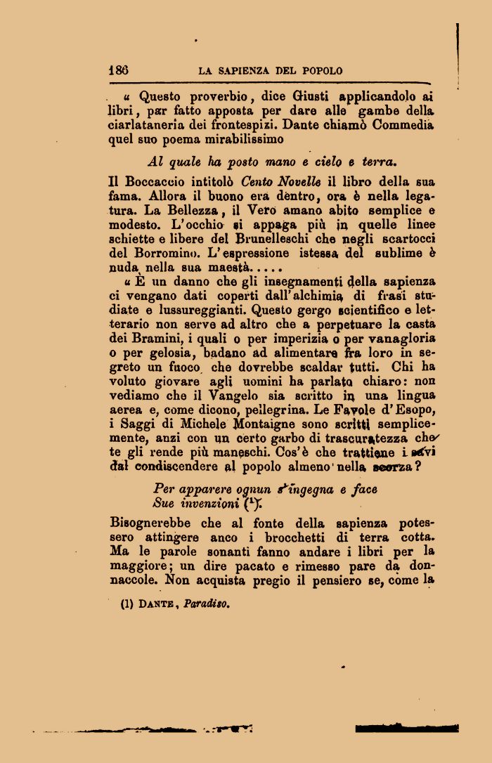 u Questo proverbio, dice Giusti applicandolo ai libri, par fatto apposta per dare alle gambe della ciarlataneria dei frontespizi. Dante chiamò Commedia quel suo poema mirabilissimo