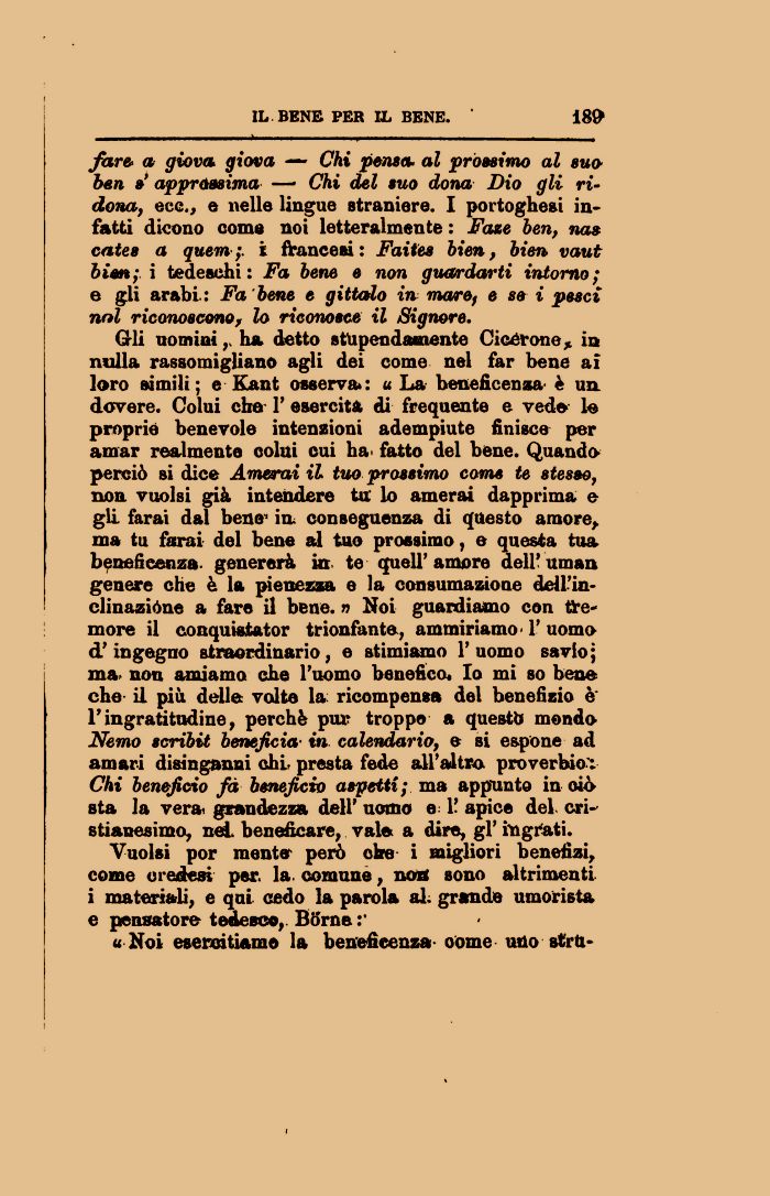 Gli nomini,, ha detto stupendamente Cicerone, in nulla rassomigliano agli dei come nel far bene ai loro simili; e Kant osservai: u La beneficenza è un. dovere. Colui che 1' esercita di frequente e vede le proprie benevole intenzioni adempiute finisce per amar realmente colui cui ha fatto del bene. Quando perciò si dice Amerai il tuo prossimo come te stesso, non vuoisi già intendere tu lo amerai dapprima e gli farai dal bene1 in conseguenza di questo amore, ma tu farai del bene al tuo prossimo, e questa tua beneficenza, genererà in te quell' amore dell! uman genere che è la pienezza e la consumazione dell'inclinazióne a fare il bene, n Noi guardiamo con tremore il conquistator trionfante, ammiriamo' 1' uomo d'ingegno straordinario, e stimiamo l'uomo savio; ma> non amiamo che l'uomo benefico. Io mi so bene che il più delle volte la ricompensa del benefizio è l'ingratitudine, perchè pur troppo a questo mondo Nemo scribit beneficia• in calendario, e si espone ad amari disinganni chi. presta fede all'altro proverbio': Chi beneficio fà beneficio aspetti; ma appunto in oiò sta la vera grandezza, dell' uomo e: 1! apice del. cristianesimo, nel. beneficare, vai» a dire, gì' ingrati.