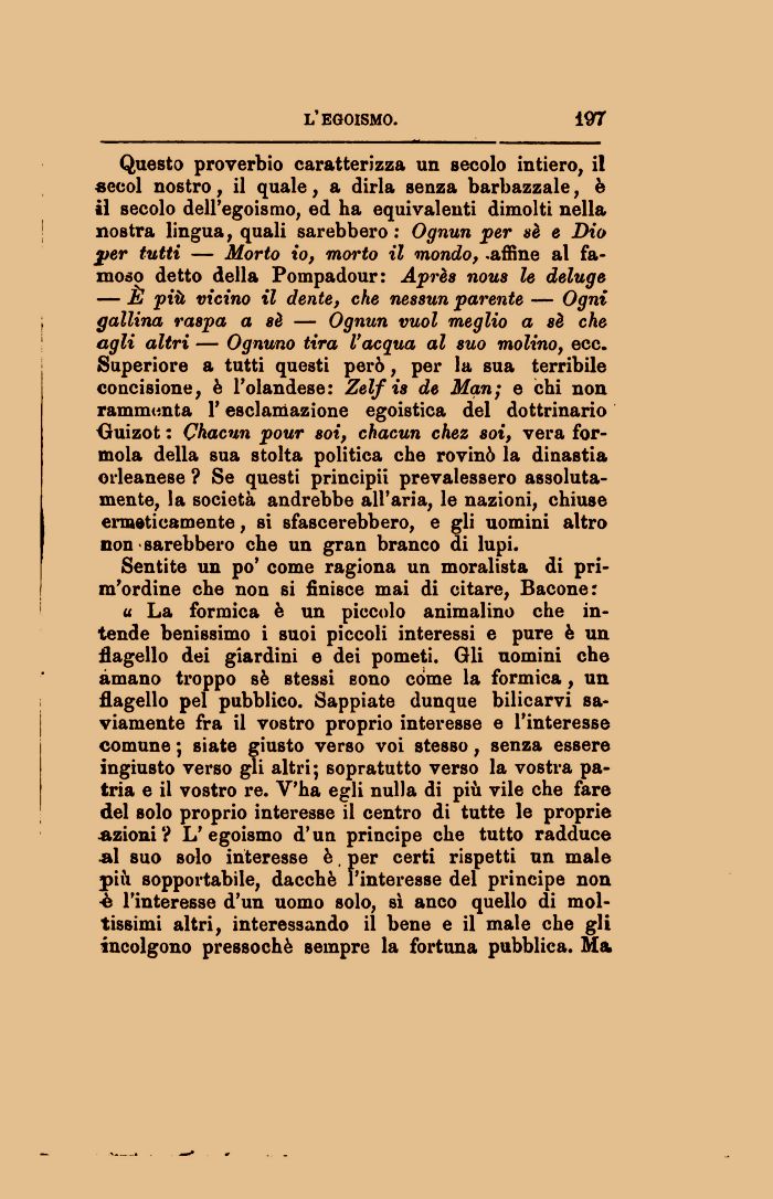 Questo proverbio caratterizza un secolo intiero, il secol nostro, il quale, a dirla senza barbazzale, è il secolo dell'egoismo, ed ha equivalenti dimolti nella nostra lingua, quali sarebbero : Ognun per sè e Dio 2>er tutti — Morto io, morto il mondo, .affine al famoso detto della Pompadour: Après nous le deluge — È più vicino il dente, che nessun parente — Ogni gallina raspa a sè — Ognun vuol meglio a sè che agli altri — Ognuno tira l'acqua al suo molino, ecc. Superiore a tutti questi però, per la sua terribile concisione, è l'olandese: Zelf is de Man; e chi non rammenta l'esclamazione egoistica del dottrinario Guizot : Chacun pour soi, chacun chez soi, vera forinola della sua stolta politica che rovinò la dinastia oileanese ? Se questi principii prevalessero assolutamente, la società andrebbe all'aria, le nazioni, chiuse emeticamente, si sfascerebbero, e gli uomini altro non sarebbero che un gran branco di lupi.