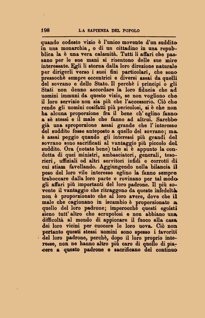 quando codesto vizio è l'unico movente d'un suddito in una monarchia, o di un cittadino in una repubblica la è una vera calamità. Tutti li affari che passano per le sue mani si risentono delle sue mire interessate. Egli li storna dalla loro direzione naturale per dirigerli verso i suoi fini particolari, che sono pressoché sempre eccentrici e diversi assai da quelli del sovrano e dello Stato. Il perchè i principi o gli Stati non denno accordare la loro fiducia che ad uomini immuni da questo vizio, se non vogliono che il loro servizio non sia più che l'accessorio. Ciò che rende gli uomini cosifatti più pericolosi, si è che non ha alcuna proporzione fra il bene eh' eglino fanno-a sè stessi e il male che fanno ad altrui. Sarebbe già una sproporzione assai grande che l'interesse del suddito fosse anteposto a quello del sovrano; ma. è assai peggio quando gli interessi più grandi del sovrano sono sacrificati al vantaggio più piccolo del. suddito. Ora (notate bene) tale si è appunto la condotta di quei ministri, ambasciatori, generali, tesorieri , uffiziali od altri servitori infidi e corrotti di cui stiam favellando. Aggiungendo nella bilancia il peso del loro vile interesse eglino la fanno sempre traboccare dalla loro parte e rovinano per tal modo gli affari più importanti del loro padrone. Il più sovente il vantaggio che ritraggono da queste infedeltà non è proporzionato che al loro avere, dove che il male che cagionano in iscambio è proporzionato a quello del loro padrone; imperocché questi egoisti sieno tutt' altro che scrupolosi e non abbiano una difficoltà al mondo di appiccare il fuoco alla casa dei loro vicini per cuocere le loro uova. Ciò non pertanto questi stessi uomini sono spesso i favoriti del loro padrone, perchè, dopo il loro proprio interesse, non ne hanno altro più caro di quello di piacere a questo padrone e sacrificano del continuo