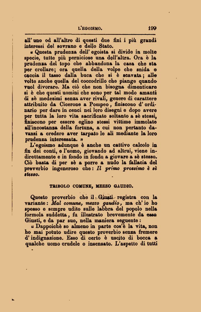 « Questa prudenza dell' egoista si divide in molte specie, tutte più perniciose una dell'altra. Ora è la prudenza del topo che abbandona la casa che sta per crollare; ora quella della volpe che snida e caccia il tasso dalla buca che si è scavata ; allo volte anche quella del coccodrillo che piange quando vuol divorare. Ma ciò che non bisogna dimenticare si è che questi uomini che sono per tal modo amanti di sè medesimi senza aver rivali, genere di carattere attribuito da Cicerone a Pompeo, finiscono d' ordinario per dare in cenci nei loro disegni e dopo avere per tutta la loro vita sacrificato soltanto a se stessi, finiscono per essere eglino stessi vittime immolate all'incostanza della fortuna, a cui non pertanto da-vansi a credere aver tarpato le ali mediante la loro prudenza interessata, n