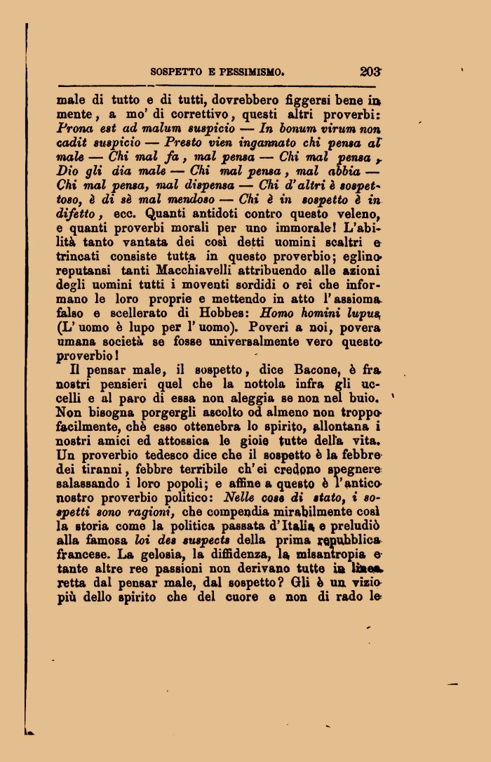 male di tutto e di tutti, dovrebbero figgerai bene i» mente, a mo'di correttivo, questi altri proverbi: Prona est ad malum auspicio — In bonum virum non cadit suspicio — Presto vien ingannato chi pensa al male — Chi mal fa, mal pensa — Chi mal pensa y Dio gli dia male — Chi mal pensa , mal abbia — Chi mal pensa, mal dispensa — Chi d'altri è sospet» toso, è di sè mal mendoso — Chi è in sospetto è in difetto, ecc. Quanti antidoti contro questo veleno, e quanti proverbi morali per uno immorale! L'abilità tanto vantata dei così detti uomini scaltri e trincati consiste tutta in questo proverbio; eglino reputansi tanti Macchiavelli attribuendo alle azioni degli uomini tutti i moventi sordidi o rei che informano le loro proprie e mettendo in atto l'assioma falso e scellerato di Hobbes: Homo homini lupus, (L' uomo è lupo per 1' uomo). Poveri a noi, povera umana società se fosse universalmente vero questo proverbio !