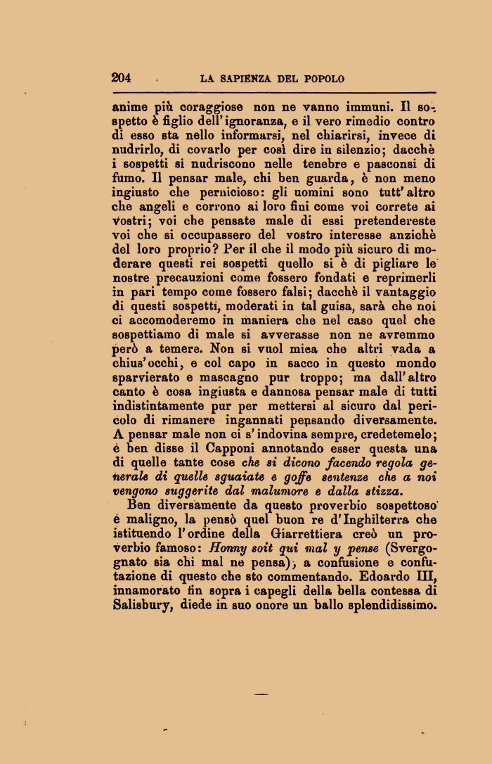 Ben diversamente da questo proverbio sospettoso' é maligno, la pensò quel buon re d'Inghilterra che istituendo l'ordine della Giarrettiera creò un proverbio famoso: Honny soit qui mal y pense (Svergognato sia chi mal ne pensa), a confusione e confutazione di questo che sto commentando. Edoardo III, innamorato fin sopra i capegli della bella contessa di Salisbury, diede in suo onore un ballo splendidissimo.