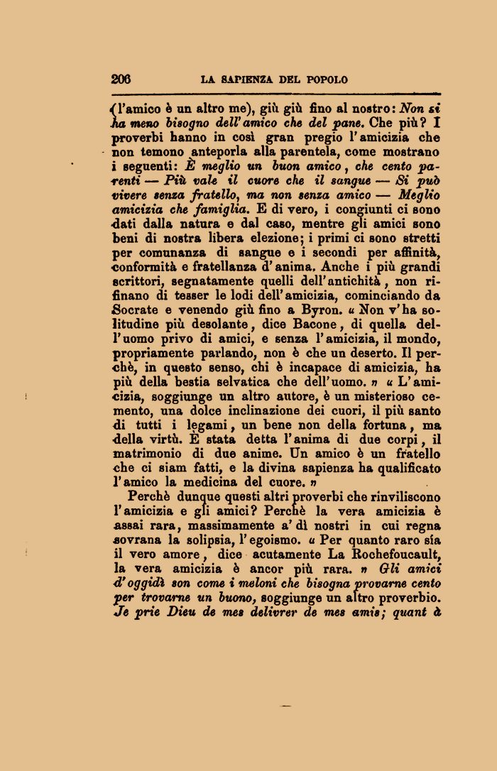 Perchè dunque questi altri proverbi che rinviliscono l'amicizia e gli amici? Perchè la vera amicizia è assai rara, massimamente a' dì nostri in cui regna sovrana la solipsia, l'egoismo, u Per quanto raro sia il vero amore, dice acutamente La Rochefoucault, la vera amicizia è ancor più rara, n Gli amici ¦d'oggidì, son come i meloni che bisogna provarne cento per trovarne un buono, soggiunge un altro proverbio. Je prie Dieu de mes delivrer de mes amis; quant à