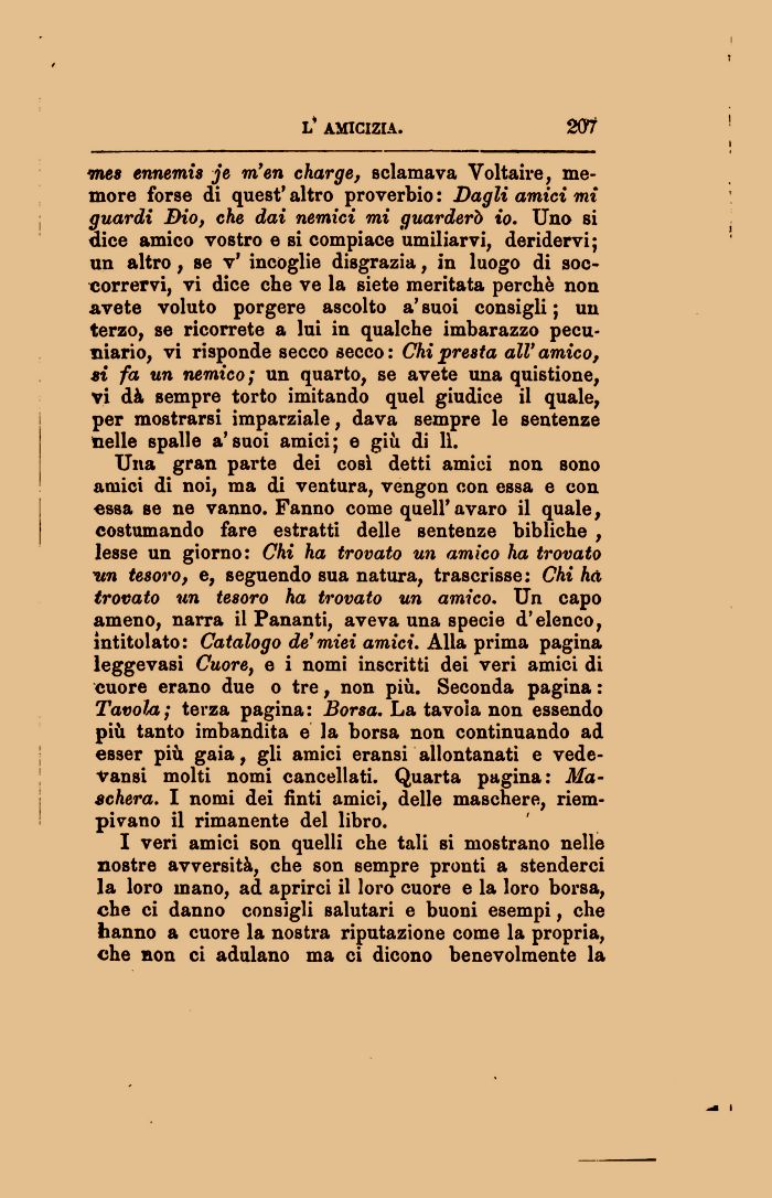 Una gran parte dei così detti amici non sono amici di noi, ma di ventura, vengon con essa e con essa se ne vanno. Fanno come quell'avaro il quale, costumando fare estratti delle sentenze bibliche , lesse un giorno: Chi ha trovato un amico ha trovato un tesoro, e, seguendo sua natura, trascrisse: Chi ha trovato un tesoro ha trovato un amico. Un capo ameno, narra il Pananti, aveva una specie d'elenco, intitolato: Catalogo de'miei amici. Alla prima pagina leggevasi Cuore, e i nomi inscritti dei veri amici di cuore erano due o tre, non più. Seconda pagina : Tavola; terza pagina: Borsa. La tavola non essendo più tanto imbandita e la borsa non continuando ad esser più gaia, gli amici eransi allontanati e vede-vansi molti nomi cancellati. Quarta pagina: Maschera. I nomi dei finti amici, delle maschere, riempivano il rimanente del libro.