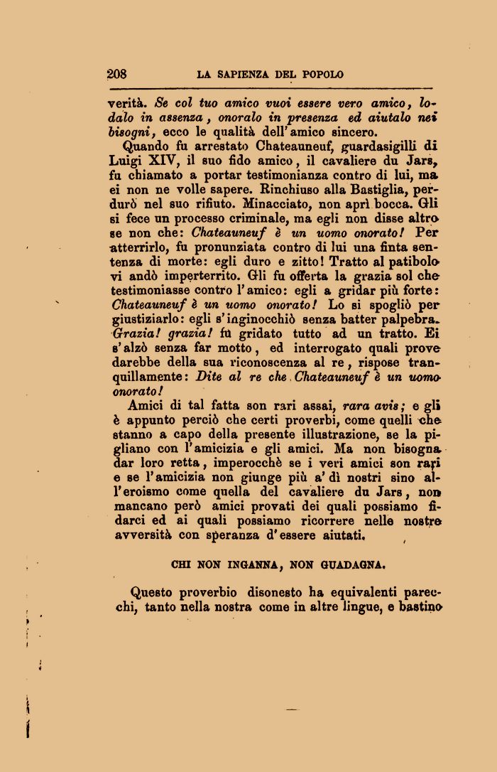 Amici di tal fatta son rari assai, rara avis ; e gli è appunto perciò che certi proverbi, come quelli che stanno a capo della presente illustrazione, se la pigliano con l'amicizia e gli amici. Ma non bisogna dar loro retta, imperocché se i veri amici son rafi e se l'amicizia non giunge più a'dì nostri sino all'eroismo come quella del cavaliere du Jars, non mancano però amici provati dei quali possiamo fidarci ed ai quali possiamo ricorrere nelle nostre avversità con speranza d'essere aiutati,