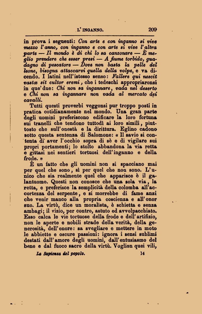 E un fatto che gli uomini non si spacciano mai per quel che sono, si per quel che non sono. L'u-nico che sia realmente quel che apparisce è il galantuomo. Questi non conosce che una sola via, la retta, e preferisce la semplicità della colomba all'accortezza del serpente, e si morrebbe di fame anzi che venir manco alla propria coscienza e all'onor suo. La virtù, dice un moralista, è schietta e senza ambagi; il vizio, per contro, astuto ed avvolpacchiato. Esso calca le vie tortuose della frode e dell' artifizio, non le aperte e nobili strade della verità, della generosità, dell'onore: sa svegliare e mettere in moto le abbiette e oscure passioni: ignora i sensi sublimi destati dall'amore degli uomini, dall'entusiasmo del bene e dal fuoco sacro della virtù. Yoglion quei vili, La Sapienza del popolo. 14