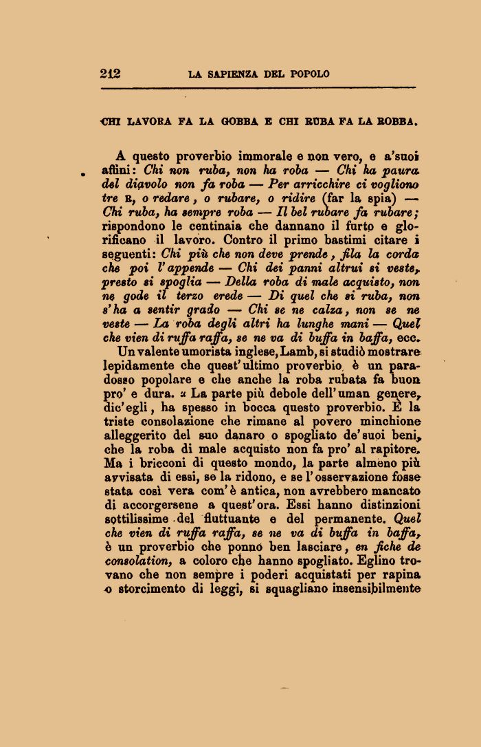 Un valente umorista inglese, Lamb, si studiò mostrare lepidamente che quest'ultimo proverbio è un paradosso popolare e che anche la roba rubata fa buon prò' e dura, a La parte più debole dell'uman genere, die'egli, ha spesso in bocca questo proverbio. È la triste consolazione che rimane al povero minchione alleggerito del suo danaro o spogliato de'suoi beni, che la roba di male acquisto non fa prò' al rapitore. Ma i bricconi di questo mondo, la parte almeno più ayvisata di essi, se la ridono, e se l'osservazione fosse stata cosi vera com' è antica, non avrebbero mancato di accorgersene a quest'ora. Essi hanno distinzioni sottilissime del fluttuante e del permanente. Quel che vien di ruffa raffa, se ne va di buffa in baffa, è un proverbio che ponnO ben lasciare, en fiche de consolation, a coloro che hanno spogliato. Eglino trovano che non sempre i poderi acquistati per rapina o storcimento di leggi, si squagliano insensibilmente