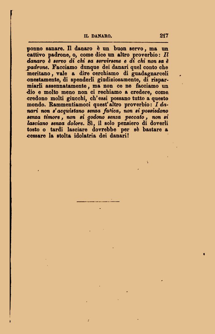 ponno sanare. Il danaro è un buon servo, ma un cattivo padrone, o, come dice un altro proverbio : Il danaro è servo di chi sa servirsene e di chi non sa è padrone. Facciamo dunque dei danari quel conto che meritano, vale a dire cerchiamo di guadagnarceli onestamente, di spenderli giudiziosamente, di risparmiarli assennatamente, ma non ce ne facciamo un •dio e molto meno non ci rechiamo a credere, come credono molti giucchi, ch'essi possano tutto a questo mondo. Rammentiamoci quest' altro proverbio : I danari non 8'acquistano senza fatica, non si possiedono senza timore, non si godono senza peccato, non si lasciano senza dolore. Sì, il solo pensiero di doverli tosto o tardi lasciare dovrebbe per sè bastare a cessare la stolta idolatria dei danari!