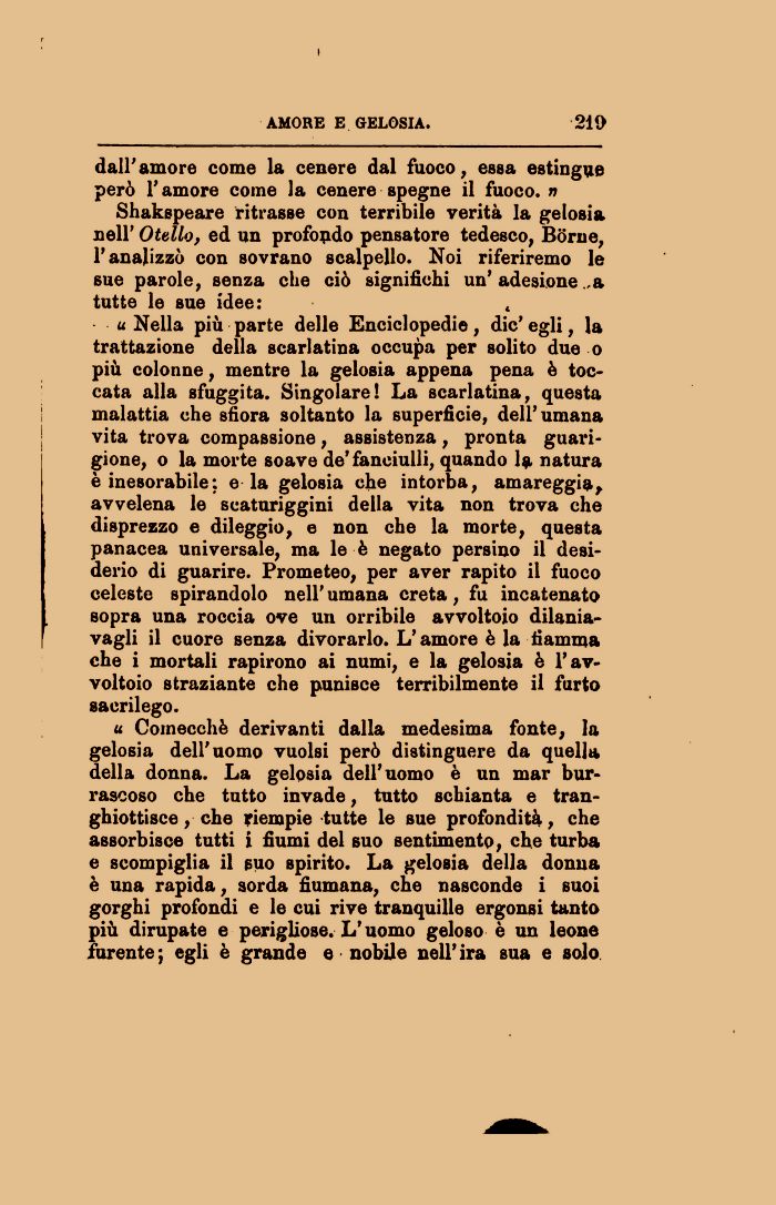 Shakspeare ritrasse con terribile verità la gelosia nell' Otello, ed un profondo pensatore tedesco, Borne, l'analizzò con sovrano scalpello. Noi riferiremo le sue parole, senza che ciò significhi un'adesione ..a tutte le sue idee: ,