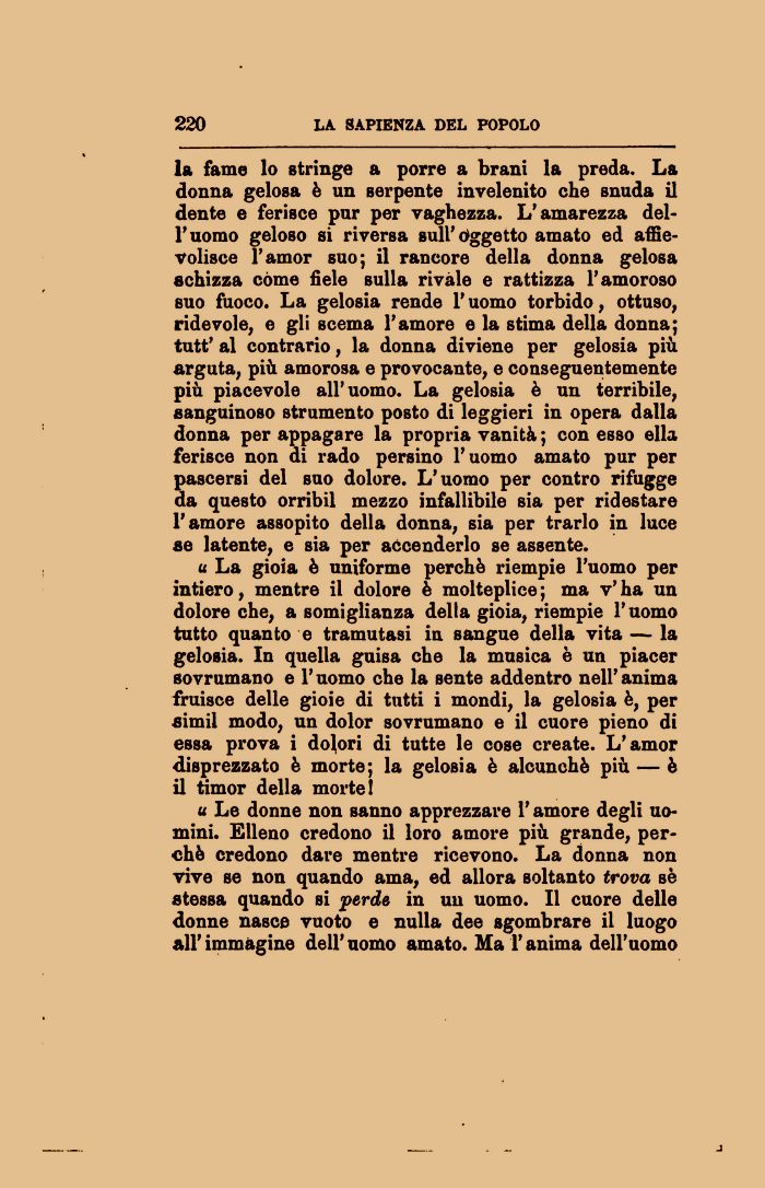 la fame lo stringe a porre a brani la preda. La donna gelosa è un serpente invelenito che snuda il dente e ferisce pur per vaghezza. L'amarezza dell'uomo geloso sì riversa sull'Oggetto amato ed affievolisce l'amor suo; il rancore della donna gelosa schizza còme fiele sulla rivale e rattizza l'amoroso suo fuoco. La gelosia rende l'uomo torbido, ottuso, ridevole, e gli scema l'amore e la stima della donna; tutt' al contrario, la donna diviene per gelosia più arguta, più amorosa e provocante, e conseguentemente più piacevole all'uomo. La gelosia è un terribile, sanguinoso strumento posto di leggieri in opera dalla donna per appagare la propria vanità ; con esso ella ferisce non di rado persino l'uomo amato pur per pascersi del suo dolore. L'uomo per contro rifugge da questo orribil mezzo infallibile sia per ridestare l'amore assopito della donna, sia per trarlo in luce se latente, e sia per accenderlo se assente.