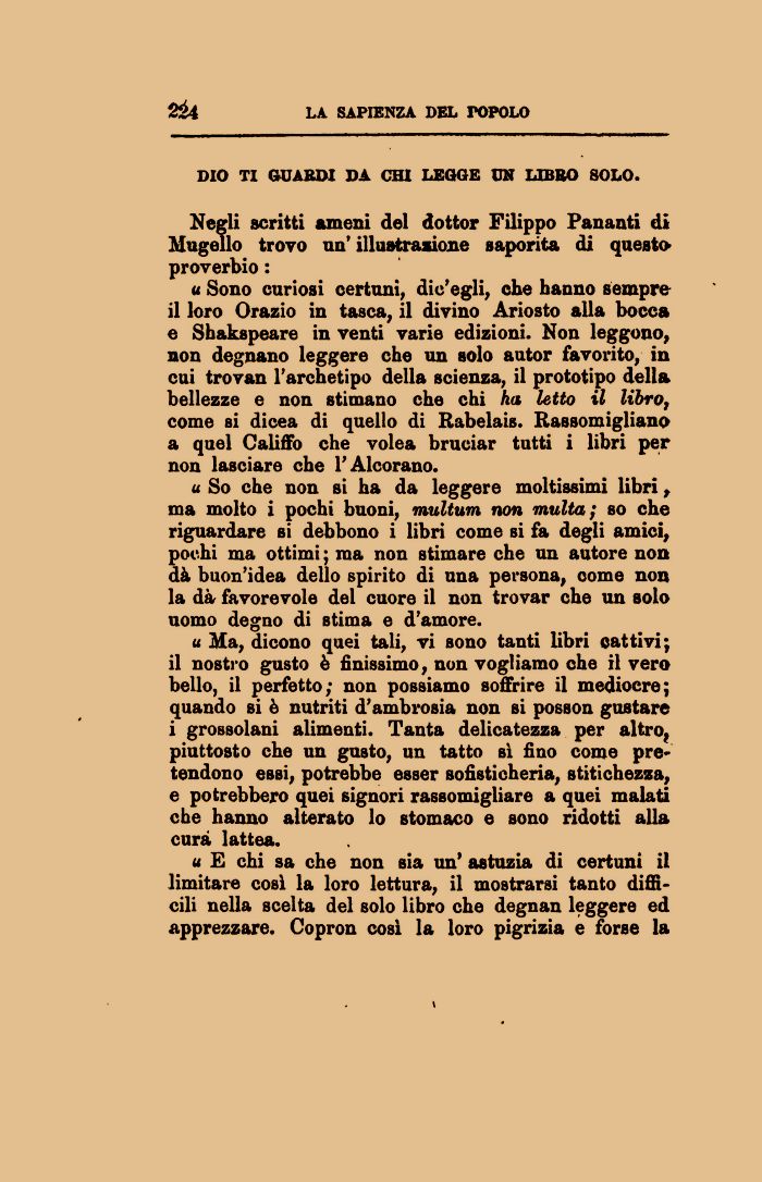 u Sono curiosi certuni, dic'egli, che hanno sempre il loro Orazio in tasca, il divino Ariosto alla bocca e Shakspeare in venti varie edizioni. Non leggono, non degnano leggere che un solo autor favorito, in cui trovan l'archetipo della scienza, il prototipo della bellezze e non stimano che chi ha letto il libro, come si dicea di quello di Rabelais. Rassomigliano a quel Califfo che volea bruciar tutti i libri per non lasciare che l'Alcorano.