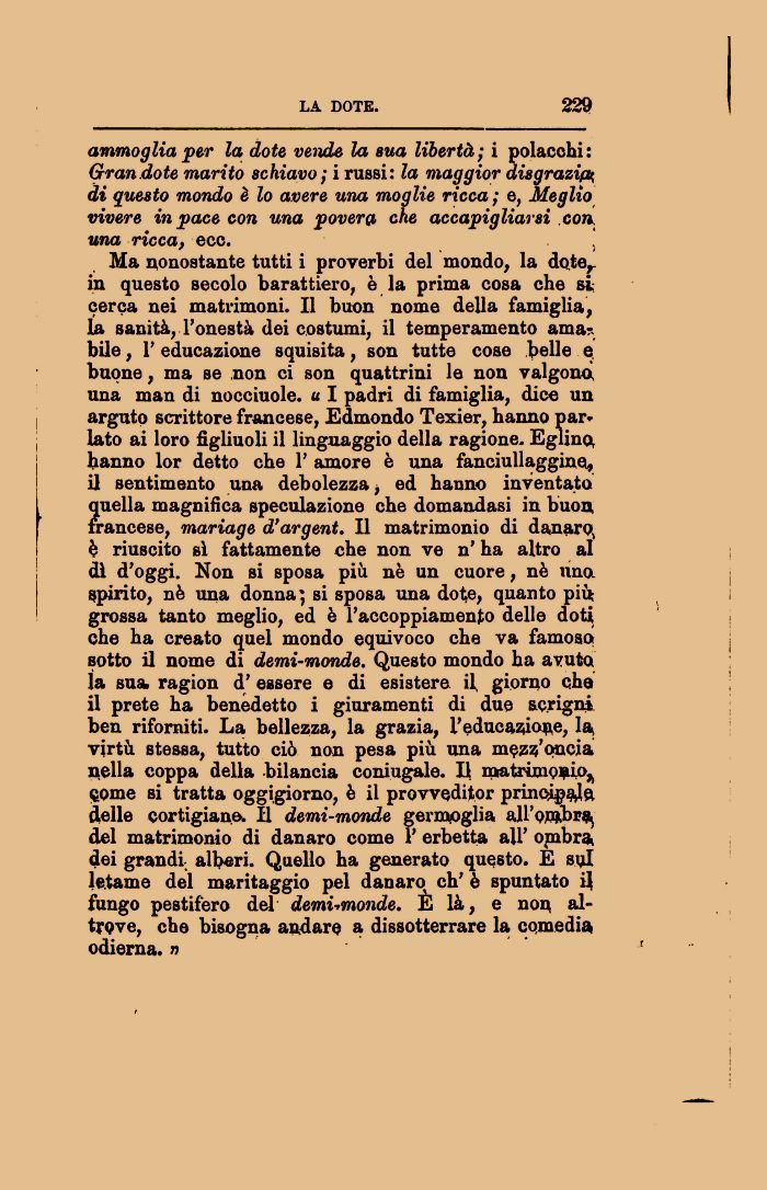Ma nonostante tutti i proverbi del mondo, la dQter in questo secolo barattiero, è la prima cosa che si. cerca nei matrimoni. Il buon nome della famiglia, la sanità, l'onestà dei costumi, il temperamento amar, bile, 1' educazione squisita, son tutte cose belle e buone, ma se non ci son quattrini le non valgono una man di nocciuole. u I padri di famiglia, dice un arguto scrittore francese, Edmondo Texier, hanno par* lato ai loro figliuoli il linguaggio della ragione. Eglino, hanno lor detto che 1' amore è una fanciullaggine, il sentimento una debolezza -, ed hanno inventato quella magnifica speculazione che domandasi in buon, francese, mariage d'argent. Il matrimonio di danaro, è riuscito sì fattamente che non ve n' ha altro al di d'oggi. Non si sposa più nè un cuore, nè una spirito, nè una donna; si sposa una dote, quanto più grossa tanto meglio, ed è l'accoppiamento delle doti che ha creato quel mondo equivoco che va famoso sotto il nome di demi-monde. Questo mondo ha avuto la sua ragion d' essere e di esistere il, giorno che il prete ha benedetto i giuramenti di due scrigni ben riforniti. La bellezza, la grazia, l'educazione, la virtù stessa, tutto ciò non pesa più una mezz'oncia nella coppa della bilancia coniugale. Il matrimo^iio^ QOme si tratta oggigiorno, è il provveditor principale delle cortigiane. Il demi-monde germoglia all'offlbr^ del matrimonio di danaro come 1' erbetta all' ombrat dei grandi alberi. Quello ha generato questo. È sul letame del maritaggio pel danaro eh' è spuntato il fungo pestifero del demi-monde. E là, e non altrove, che bisogna andare a dissotterrare la comedia odierna, n