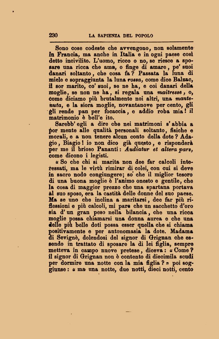 Sono cose codeste che avvengono, non solamente In Francia, ma anche in Italia e in ogni paese cosi detto incivilito. L'uomo, ricco o no, se riesce a sposare una ricca che ama, o finge di amare, pe' suoi danari soltanto, che cosa fa ? Passata la luna di miele e sopraggiunta la luna rossa, come dice Balzac, il sor marito, co' suoi, se ne ha, e coi danari della moglie, se non ne ha, si regala una maitresse, o, Come diciamo più brutalmente noi altri, una mante-huta, e la siora moglie, novantanove per cento, gli gli rende pan per focaccia, e addio roba mia ! il matrimonio è bell'e ito.